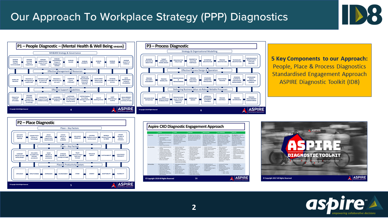 The diagnostic can be deployed in full, or simply narrowed in focus, or rapidly adapted in line with your own preferences to provide a tailored workplace strategy diagnostic review. If you prefer to design your own model then this is easily achieved with or without our help and simply and quickly loaded into the ID8 platform to run your diagnostic.