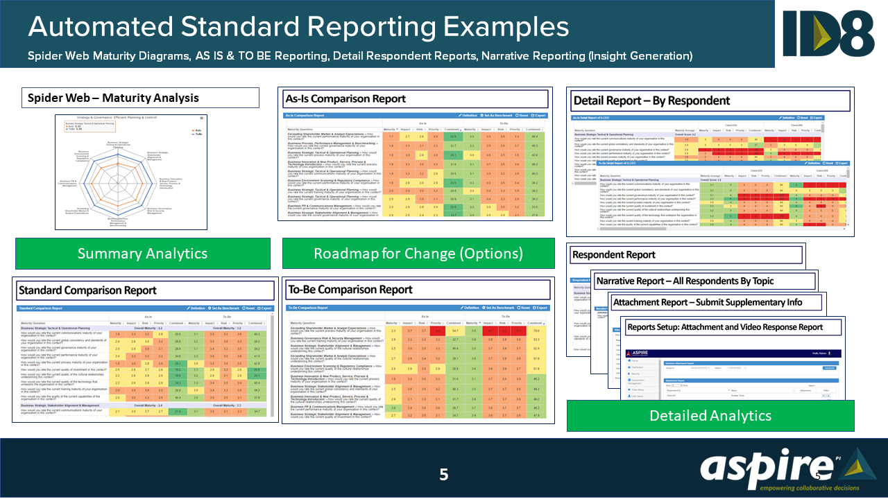 Aspire provides a wide range of spider web maturity diagrams, graphs and reports as standard out of the box options to accelerate analysis and avoid time consuming and costly report building exercises. Data can also be exported quickly for further analysis and tailored reporting as needed.